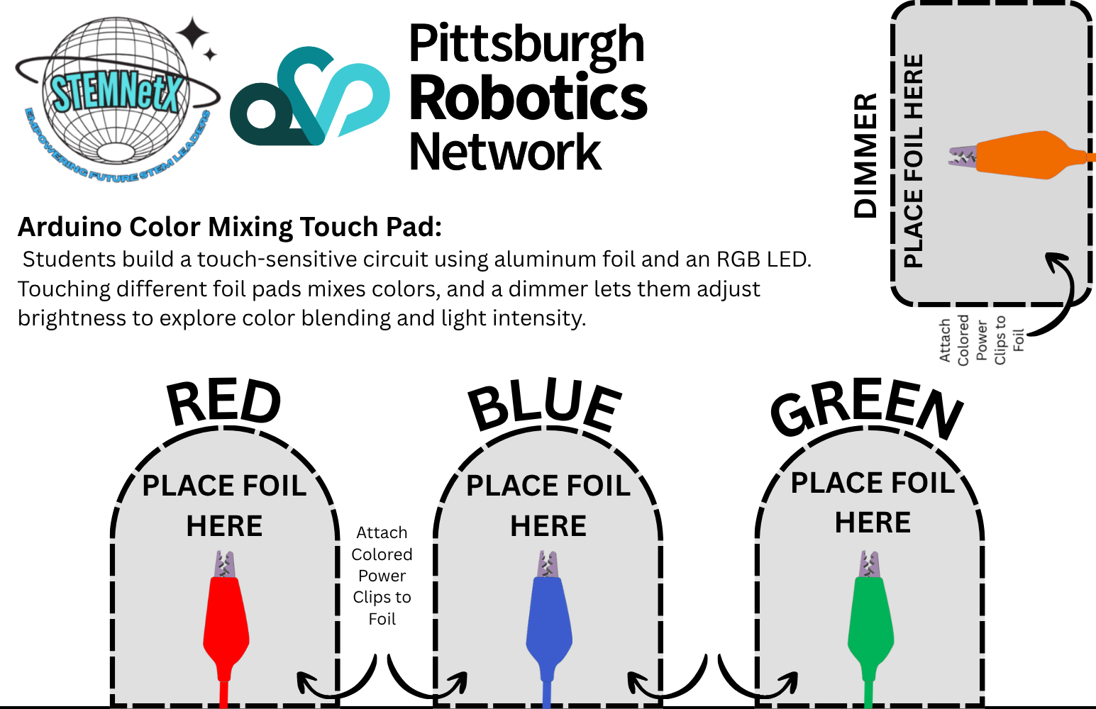 Touch the RED, GREEN, or BLUE foil pads to turn on that color of the LED.